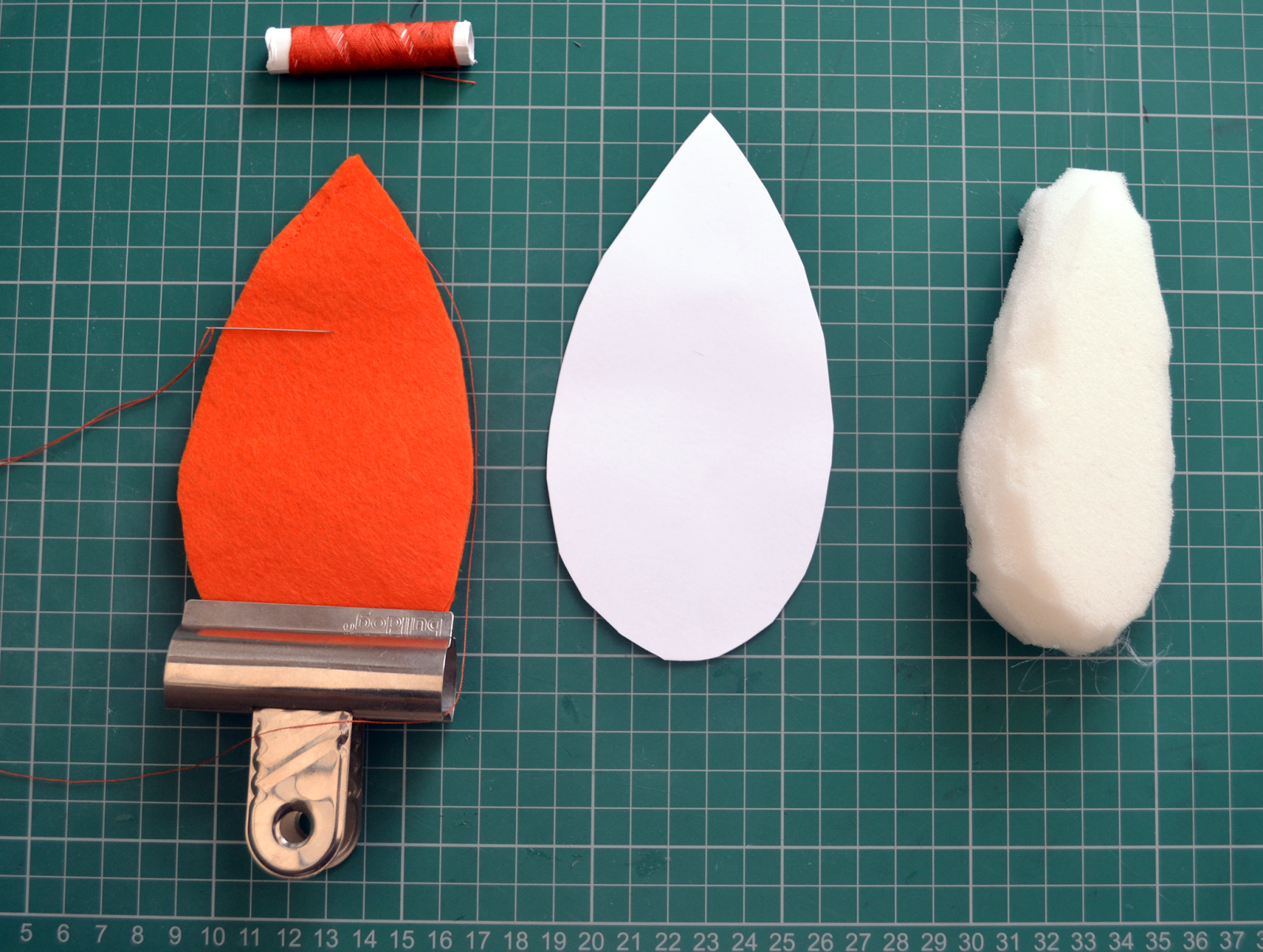 Normally the nose is in a contrasting colour to the felt used for the body, but as I've used white I wanted something that would really stand out opting for a rich orange. Create two tear drop shapes and sew together leaving a space at the top to put in the stuffing, For the eyes take two ping pong balls and slice a section (around a quarter) off the back with a sharp knife, taking care when cutting. Create an eye lid by cutting a half circle piece of felt and glueing around the ball. I also like to add a small black strip for detailing. Wait until everything is stuck on to the head before adding pupils as the positioning of the pupils might change when on the puppet, waiting until everything is in placed will inform you where best to place it.